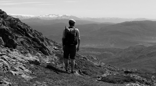 I haven't felt 'the fear' for a while and it's arrival, here in these benign, warm woods, less than an hour's drive from Bergen was surprising. We had camped the previous night aside a tranquil lake, been walking beautiful mountain trails all day and now, after a seemingly minor mistake, had just spent two hours trying to find a faint trail that would finally connect to the path of our inward journey yesterday. It's a trail I have failed to find twice before, both times going in the opposite direction, up. This time we had walked off the nose of the ridge, following a clear and definite trail. The mistake I had made was not unfolding the map properly and missing the fact that there was a second trail, right in the crease of the well folded paper. For a second I assumed I knew exactly where we were going. My friend then made the mistake of keeping quiet and not questioning my judgement when she got an inkling that this descent off the ridge wasn't as straight forward as I was making it. Minor errors that when combined lead to a descent on the wrong side of the ridge and wasted time and energy trying to rectify the situation. We didn't fancy climbing back above the tree-line to where we had missed the other trail. At least three hours. It was late and we were running out of food. We'll head due west, across a couple of kilometres of heavily wooded hillsides until we find the trail...